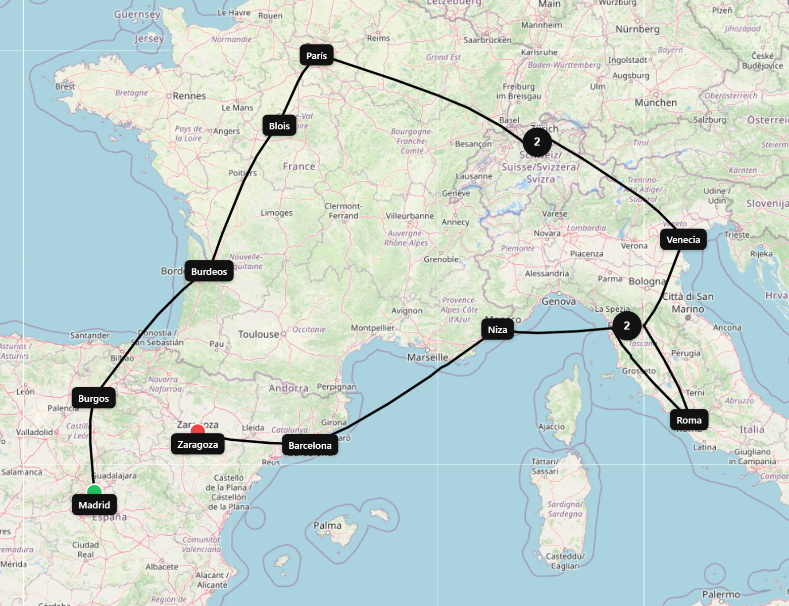 Madrid, Burgos, Burdeos, Blois, París, Lucerna, Zúrich, Venecia, Florencia, Roma, Pisa, Niza, Barcelona, Zaragoza
