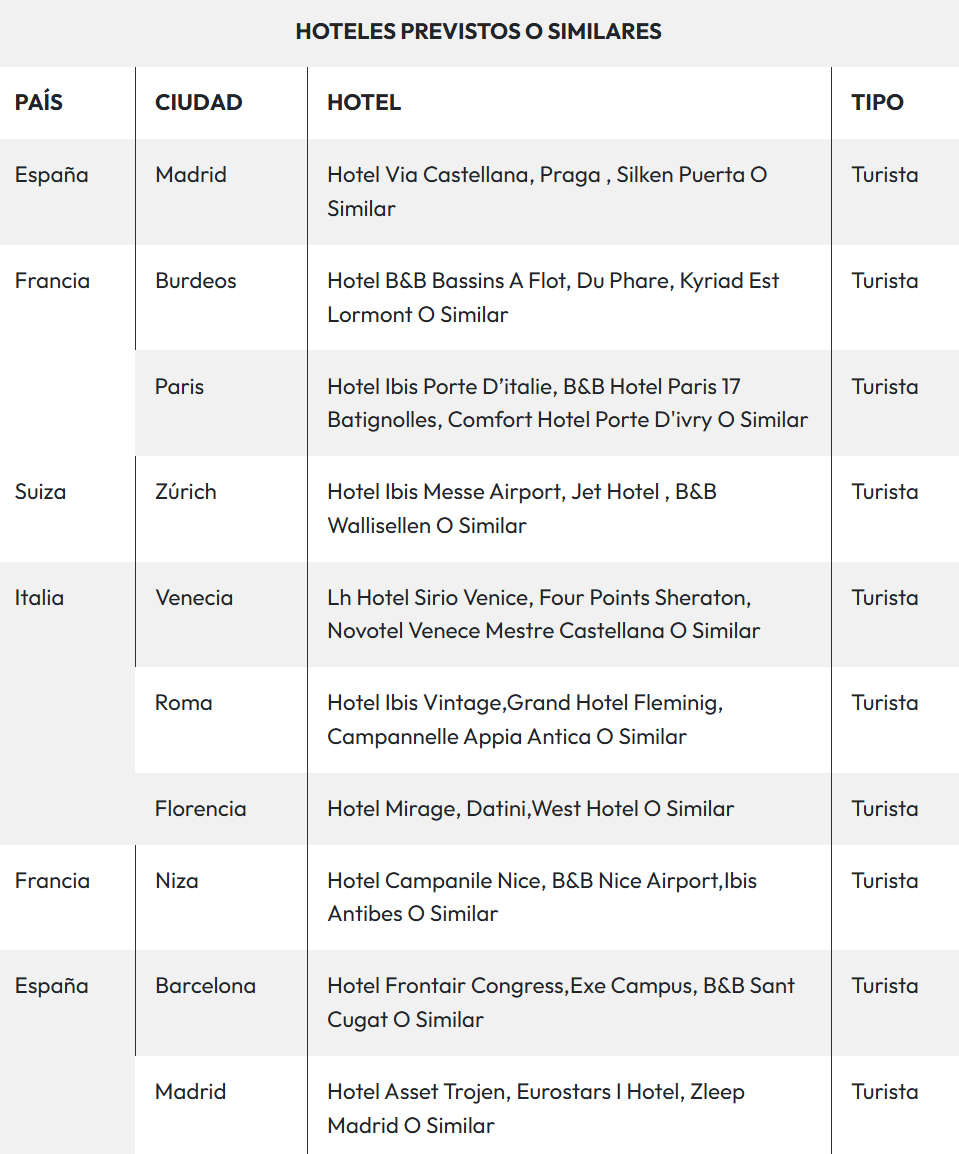 Ésta es la relación de los hoteles utilizados más frecuentemente en este circuito. Reflejada tan sólo a efectos indicativos, pudiendo ser el pasajero alojado en establecimientos similares o alternativos.