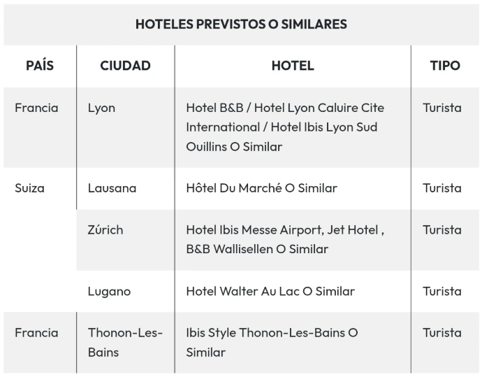 Desayuno. Salimos temprano hacia Annecy, conocida como la "Venecia de los Alpes", donde realizaremos un city tour panorámico por sus encantadoras calles y canales. Continuamos hacia Ginebra. Al llegar, tendrás tiempo libre para descubrir esta vibrante ciudad a orillas del lago Lemán. Puedes visitar el famoso Jet d'Eau, pasear por el Jardín Inglés y admirar el Reloj de Flores, o explorar la sede de las Naciones Unidas y otros organismos internacionales que tienen su sede en la ciudad. Finalmente, nos dirigimos a Lausana para descansar en el hotel. Alojamiento.