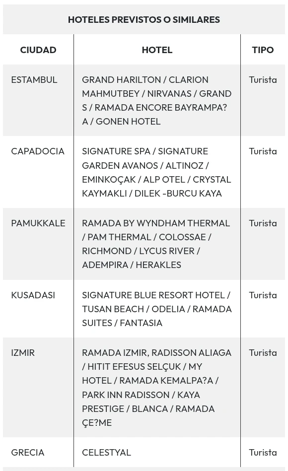 *El hospedaje podrá ser en Izmir o Kusadasi en algunas salidas. Sujeto a disponibilidad al momento de reservar