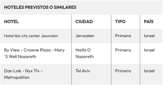 Sugerimos tomar la excursión opcional (no incluida – con costo adicional) "LA CIUDAD ANTIGUA DE JERUSALÉN" saldremos del hotel para comenzar la visita en el Monte Scopus, el Huerto de Getsemaní y la Basílica de la Agonía. Continuaremos por la ciudad Antigua: el Muro de los Lamentos, la Explanada del Templo donde se encuentran las mezquitas de Omar y El-Aksa (la entrada a las mezquitas no está permitida), continuaremos hacia la Vía Dolorosa, visitando la iglesia de la Flagelación, la Capilla de la Condena, el Calvario y el Santo Sepulcro; el Cardo Romano y el Mercado Oriental. Continuación hacia el Monte Sion para visitar la Tumba del Rey David y el Cenáculo. Por la tarde, posibilidad de tomar la excursión opcional (no incluida – con costo adicional) “BELEN CON ALMUERZO” visitaremos la basílica de la Natividad, Iglesia de Santa Catarina y la Gruta del Nacimiento. Regreso a Jerusalén.