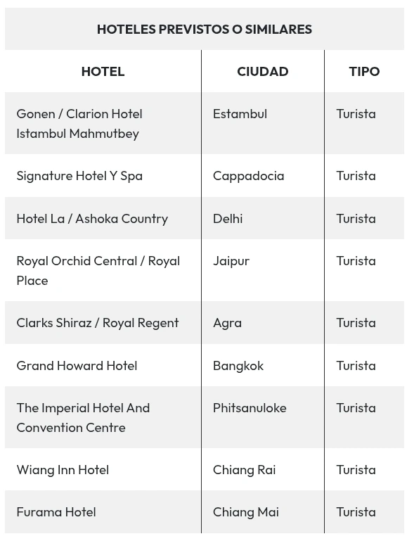 Desayuno. Check Out 12:00hrs. A la hora indicada traslado al aeropuerto de Delhi para tomar vuelo con destino a Bangkok, llegada y recepción en el aeropuerto. Traslado en autobús para tener una vista panorámica por el Gran Palacio de Bangkok, el cual ofrece una perspectiva impresionante de la ciudad. Al mirar hacia el horizonte, se pueden ver los templos y edificios históricos como el Wat Phra Kaew y el Wat Arun, rodeados de modernos rascacielos y calles bulliciosas. A lo lejos, el río Chao Phraya serpentea a través de la ciudad, reflejando la luz del sol y ofreciendo un contraste tranquilo con el ajetreo urbano; continuamos hacia Chinatown donde las calles estrechas y sinuosas se llenan de mercados callejeros, tiendas y restaurantes que exhiben una rica mezcla de arquitectura china y tailandesa. El aroma de comida se mezcla con el olor a incienso y flores, creando una experiencia sensorial única; seguiremos al mercado de flores, el cual se convierte en un mar de colores vibrantes y fragancias intensas. Miles de flores frescas, desde orquídeas exóticas hasta rosas y jazmines, se apilan en montones ordenados, creando un mosaico de tonos pastel y vivos. Tendremos una vista panorámica de El Parlamento edificio diseñado en un estilo arquitectónico tradicional tailandés con influencias modernas, se alza majestuosamente sobre el río Chao Phraya. Finalizaremos con una vista del Monumento a la Democracia ubicado en el corazón de la ciudad, un símbolo de la lucha por la democracia y la libertad en Tailandia. Alojamiento.